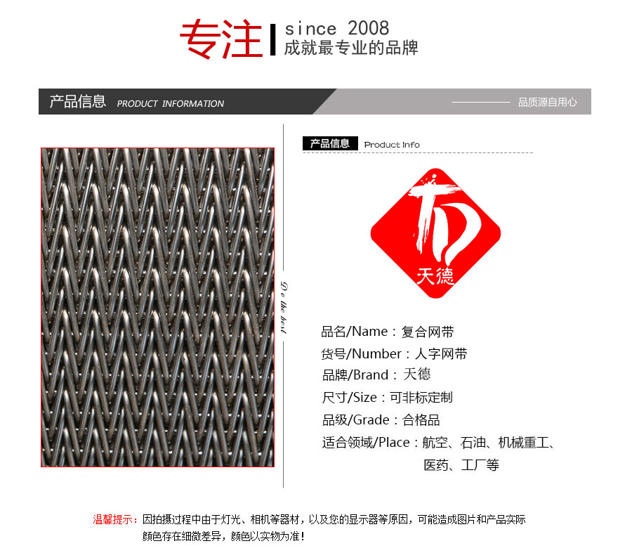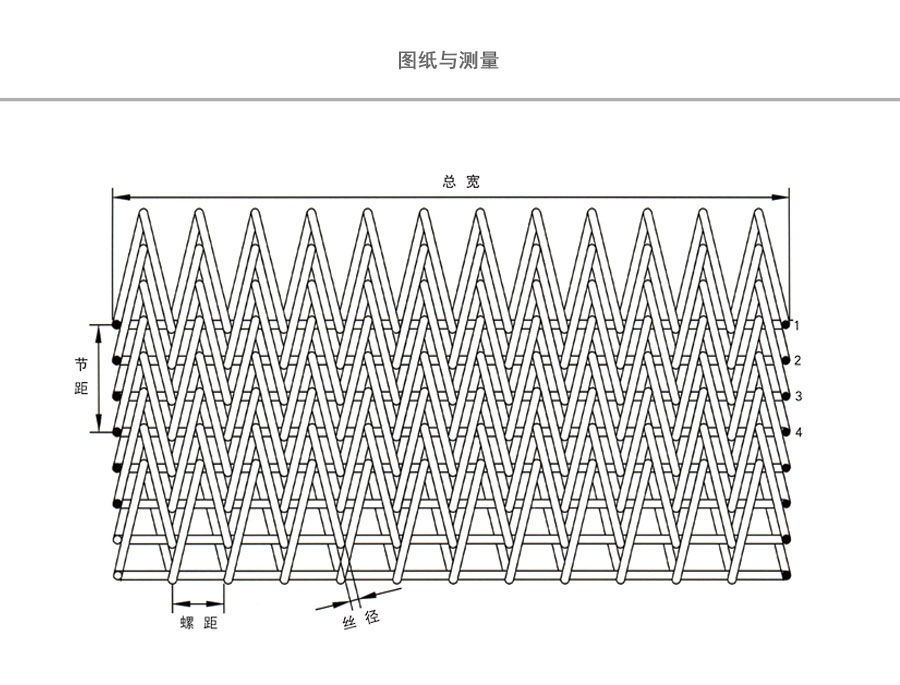人字形網帶簡介:是由左右交替的網條通過四根直串條聯結而成,此網帶可擋住較小物件的滲漏,組合牢固,抗拉強度大,廣泛應用于石油化纖、熱處理、食品工業等行業,邊緣可加擋片,直接焊 接或直接翻邊。