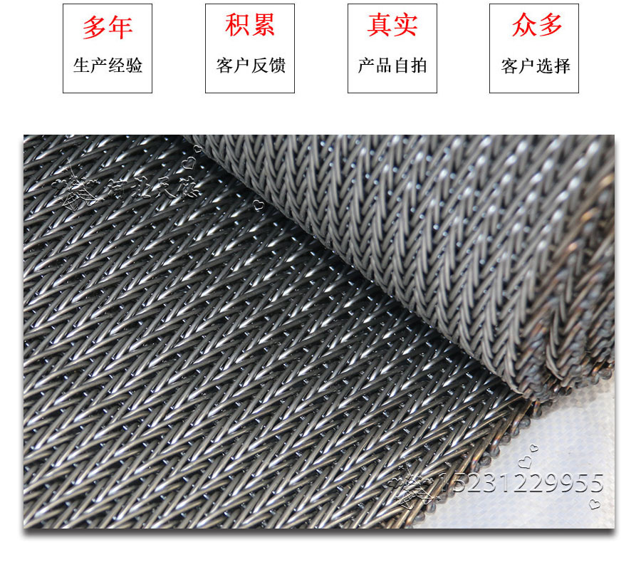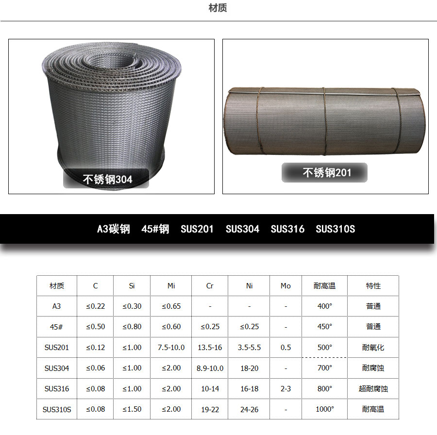 人字形網帶材質:有碳鋼、鍍鋅鐵絲,彈簧鋼絲、耐腐蝕耐高溫不銹鋼材料、A3低碳鋼、45#鋼、1Cr13耐熱鋼、201不銹鋼、304不銹鋼等。